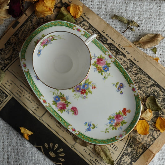 Tasse "Delia" en porcelaine anglaise fleurie et dorée avec son asssiette à gâteau