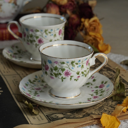 Tête-à-tête de tasses "Lily" en porcelaine anglaise fleurie et dorée Balmoral Castel