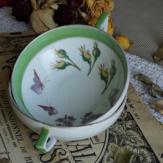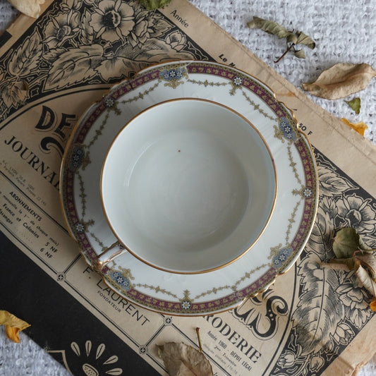 Tête-à-tête de grandes tasses "Marthe" à thé plates en porcelaine de Foëcy signées Lorioux
