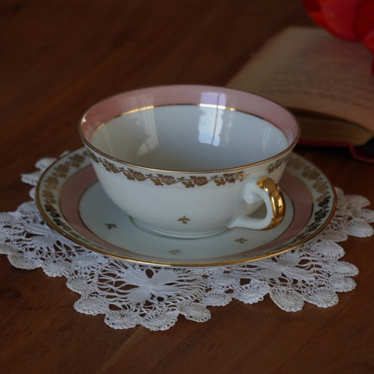 Tasse "Madlen" et sa sous-tasse/assiette à gâteau rose et dorée en porcelaine allemande bavaria
