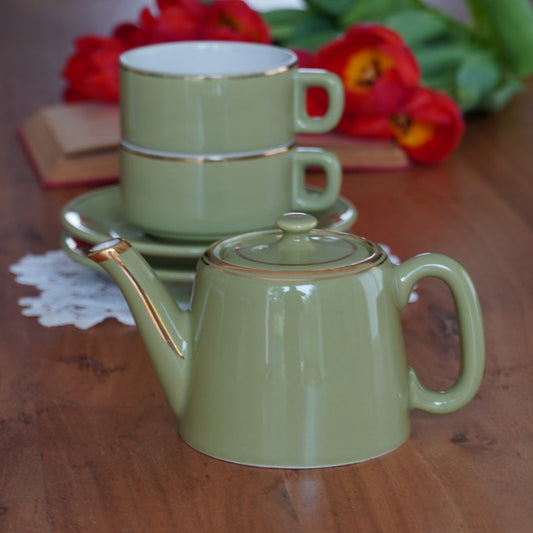 Service à thé "Hugues" en céramique vert pomme et doré style bistrot années 50/60