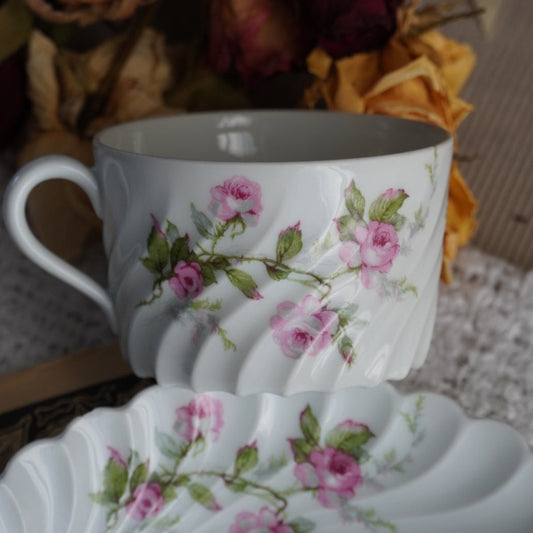 Tasse "Sylvie" et son assiette à gâteau en porcelaine de Limoges fleurie et torsadée Haviland