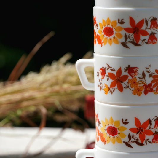 Tasses "Micheline" en verre opalin Arcopal fleuries rétro des années 70 (lot de 6)