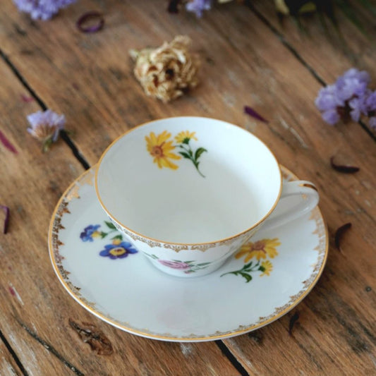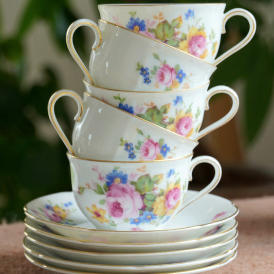 Tasses "Hortense" en porcelaine tchéque Epiag Czechoslovakia fleuries et dorées (lot de 5)