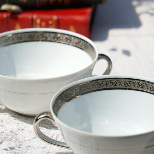 Tête à tête de tasses "Aurette" à deux anses en porcelaine de Limoges et en platine poli