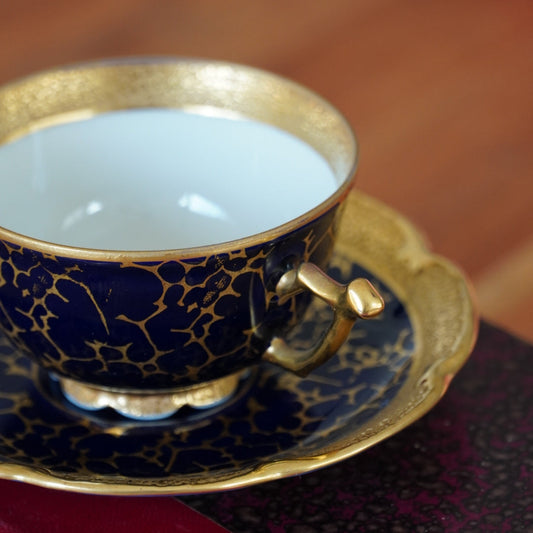 Petite tasse "Tilda" en porcelaine allemande écaillée bleu foncé cobalt et dorée Jlmeneau Graff Von Henneberg