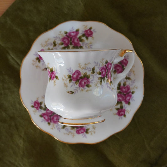 Tasse et sa grande sous-tasse "Rosie" en porcelaine anglaise Royal Albert modèle Moss Rose