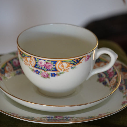 Tasse "Delia" en porcelaine anglaise fleurie et dorée avec son asssiette à gâteau