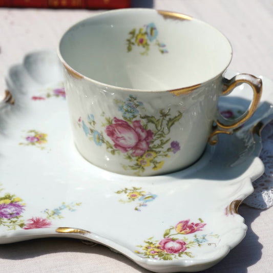 Grande tasse "Paulette" en porcelaine et sa grande sous-tasse fleuries et dorées