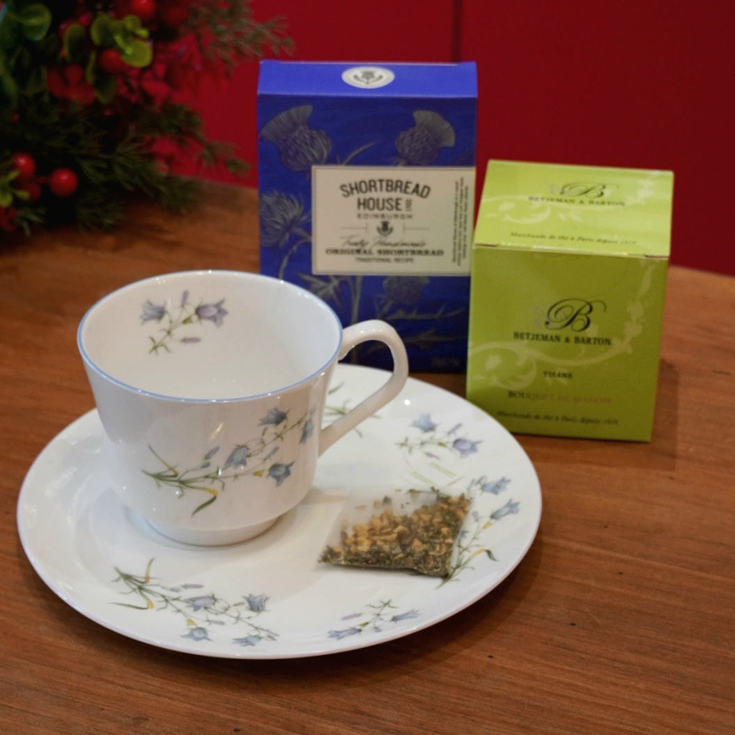 Case n°17 | Tasse et sa grande sous-tasse en porcelaine anglaise Elizabethan Moorland & boîte 25 mousselines de tisane "Bouquet de Manon" Betjeman & Barton & boîte 170g de shortbreads natures "House of Edinburgh"