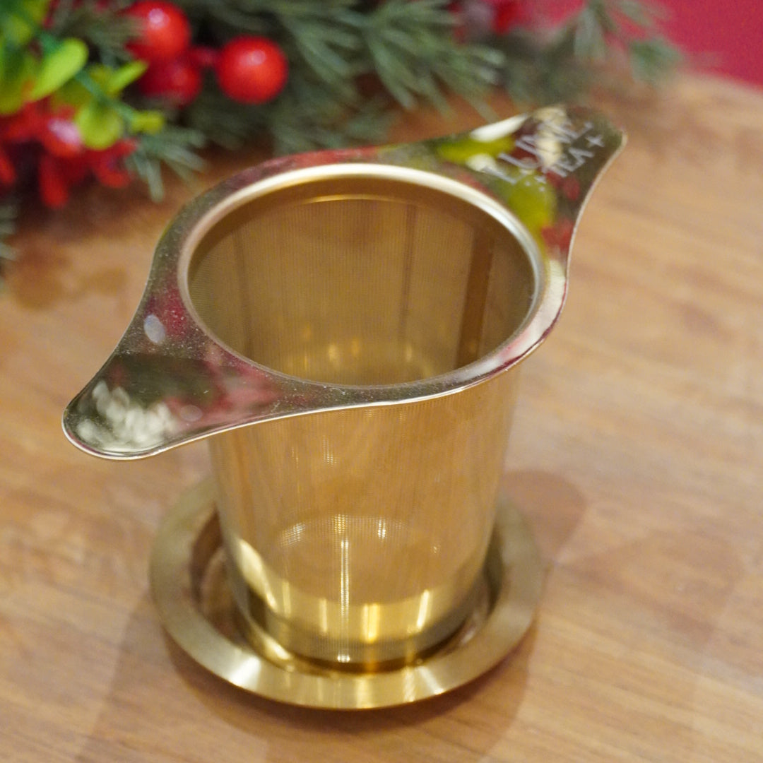 Pour accompagner ce duo, la case renferme un panier infuseur à thé doré, à la fois pratique et élégant. Il permet une infusion optimale des thés en vrac tout en apportant une touche lumineuse à votre rituel.