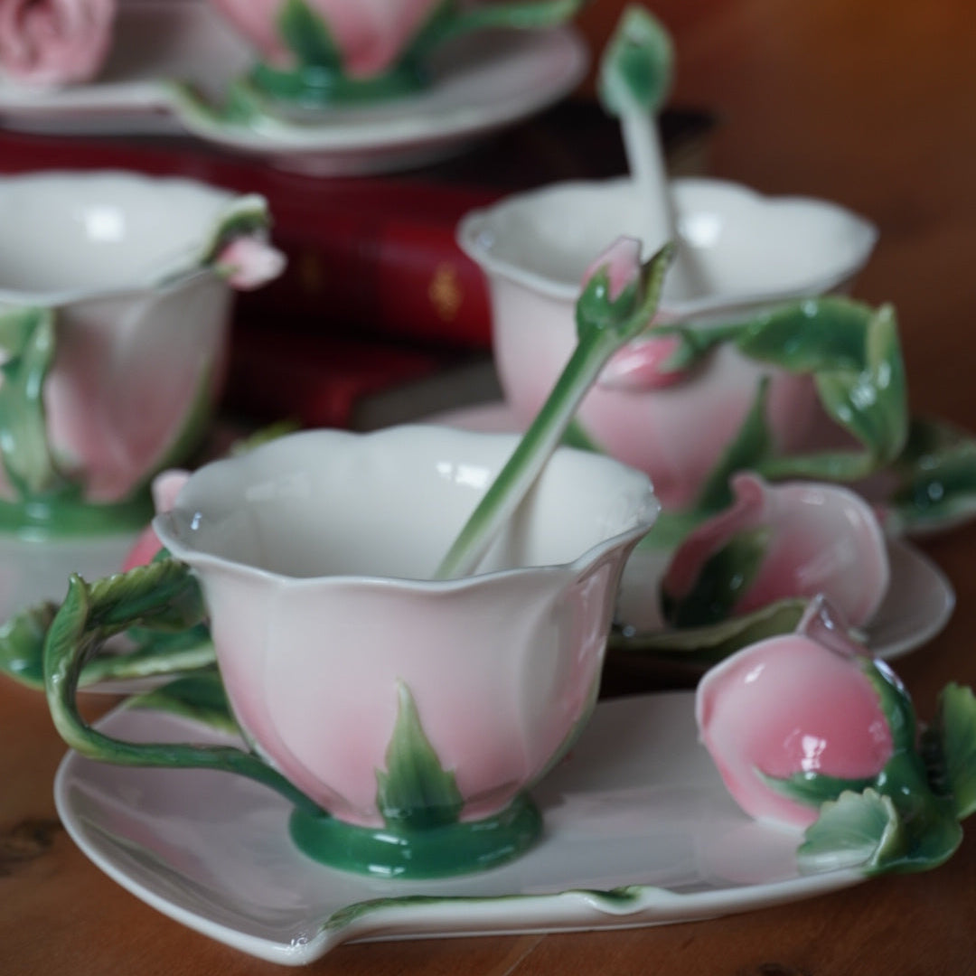 Tasses "Rosa" en forme de roses en céramique sculpté avec leurs sous-tasses et plat à gâteau (lot de 4)