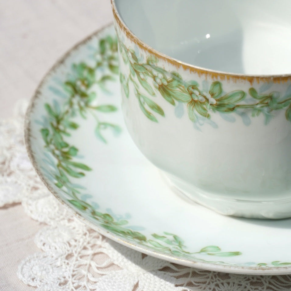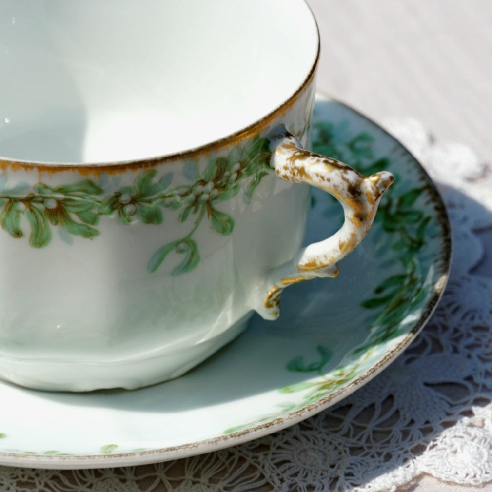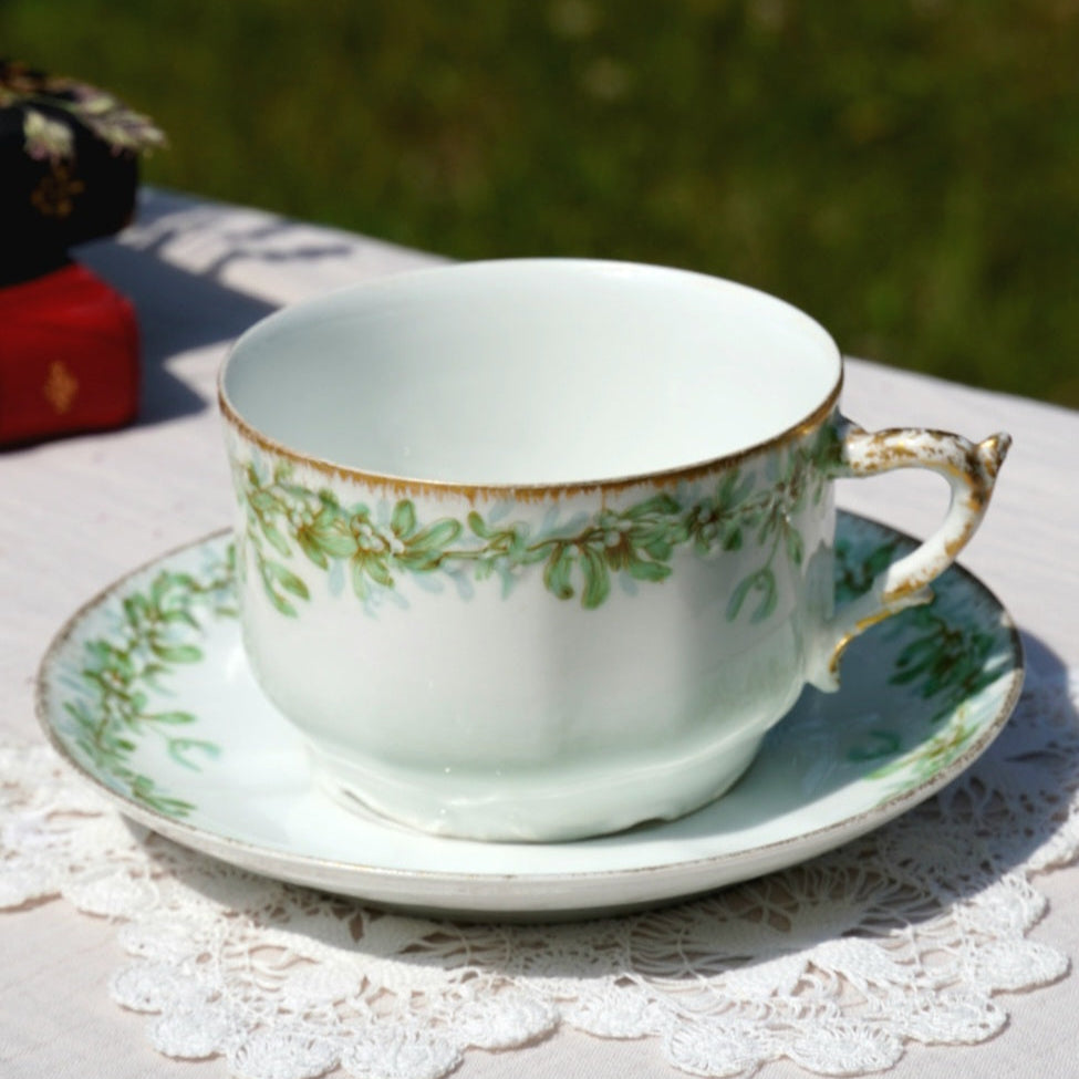 Façonnée dans l’une des plus prestigieuses manufactures de porcelaine, cette tasse se distingue par ses délicats motifs verts inspirés de la nature (feuillage fin, arabesques végétales) harmonieusement disposés sur une porcelaine blanche éclatante. Des touches de dorure appliquées à la main rehaussent le contour de la tasse et de son anse, apportant une touche luxueuse sans jamais compromettre la finesse de l'ensemble.