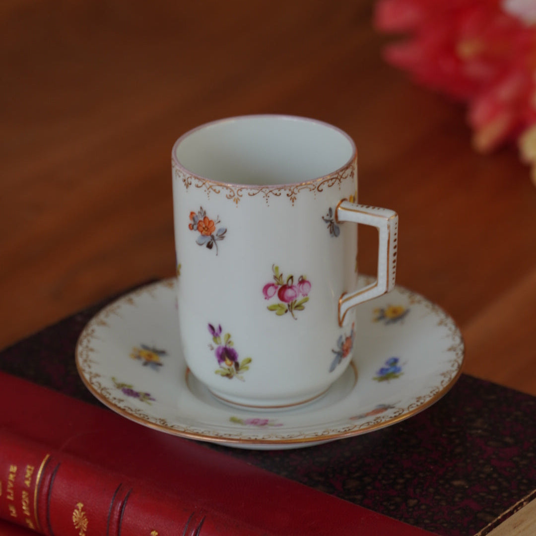 La forme élancée de cette tasse, associée à ses motifs floraux et à ses accents dorés, en fait une pièce à la fois raffinée et distinguée, idéale pour les amateurs de thé ou café ainsi que pour les collectionneurs de porcelaine ancienne européenne.