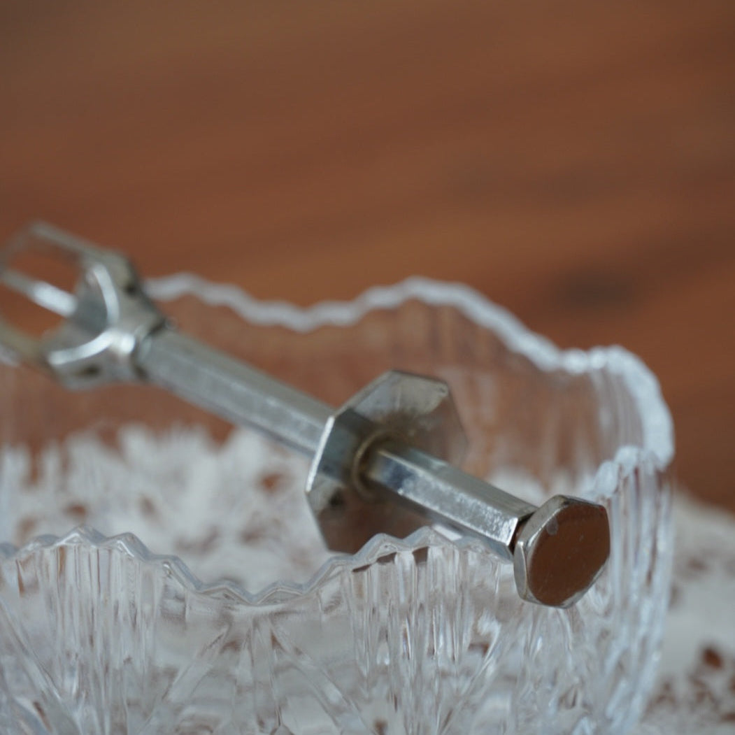 Élégante et originale, cette pince à sucre ancienne en métal argenté signée Rodrey se distingue par sa forme octogonale raffinée, aussi bien au niveau du col que de sa structure.