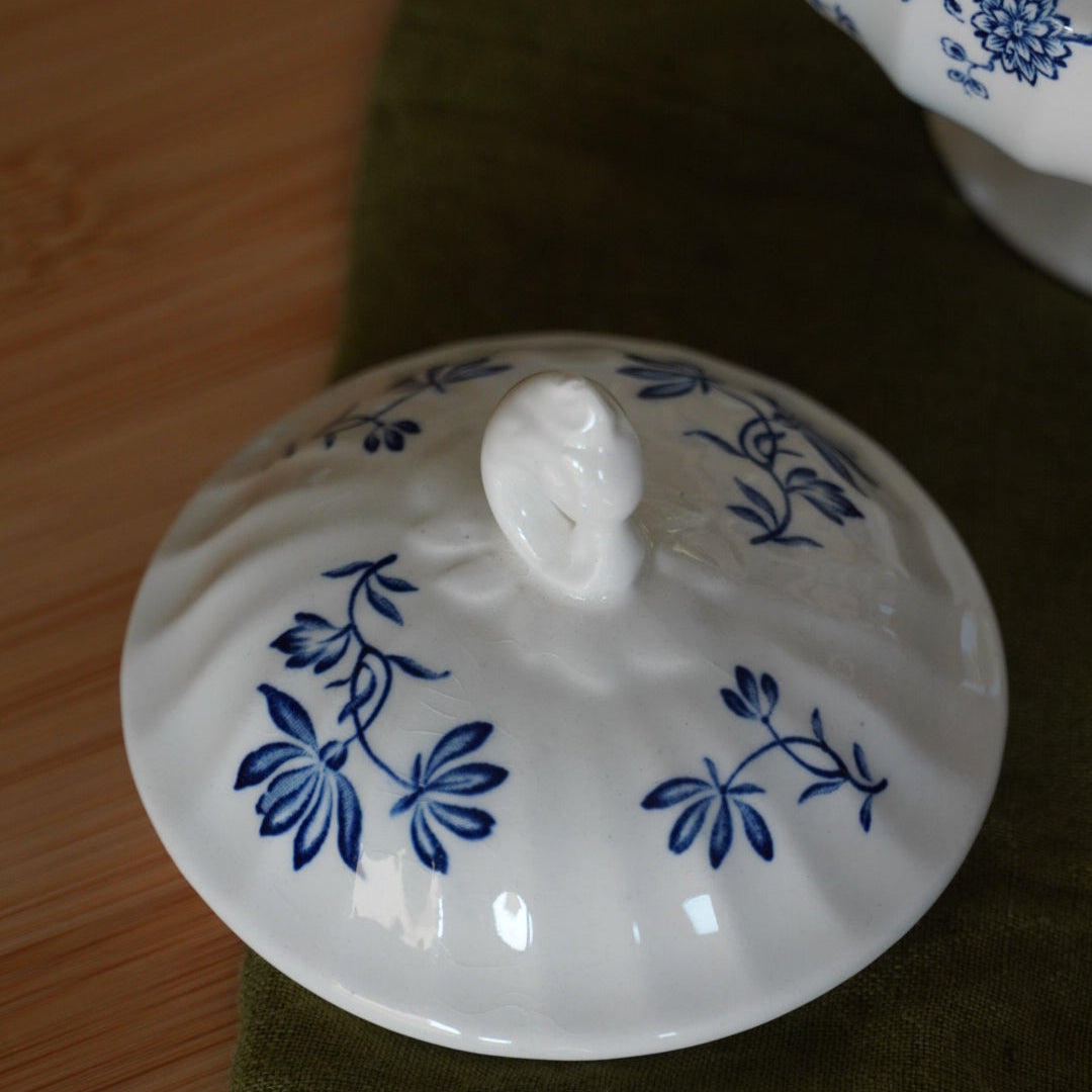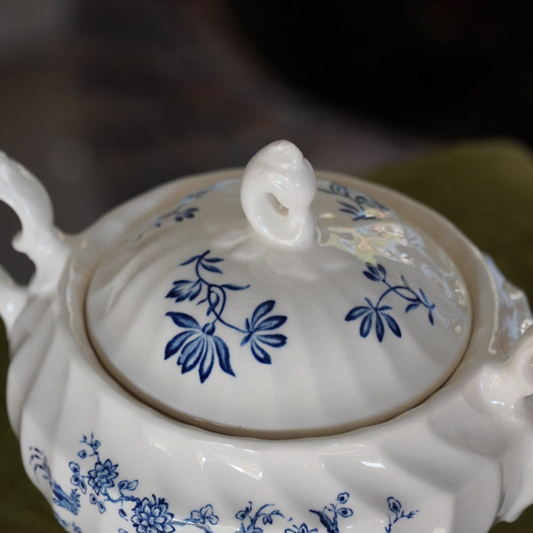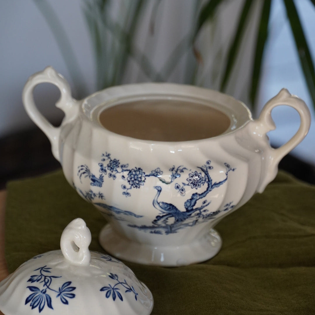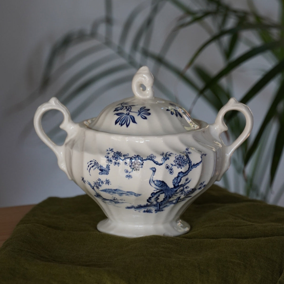 Ce ravissant sucrier ancien en céramique anglaise, signé Myott, appartient au célèbre modèle "Exotic Birds", reconnu pour ses décors colorés et raffinés.