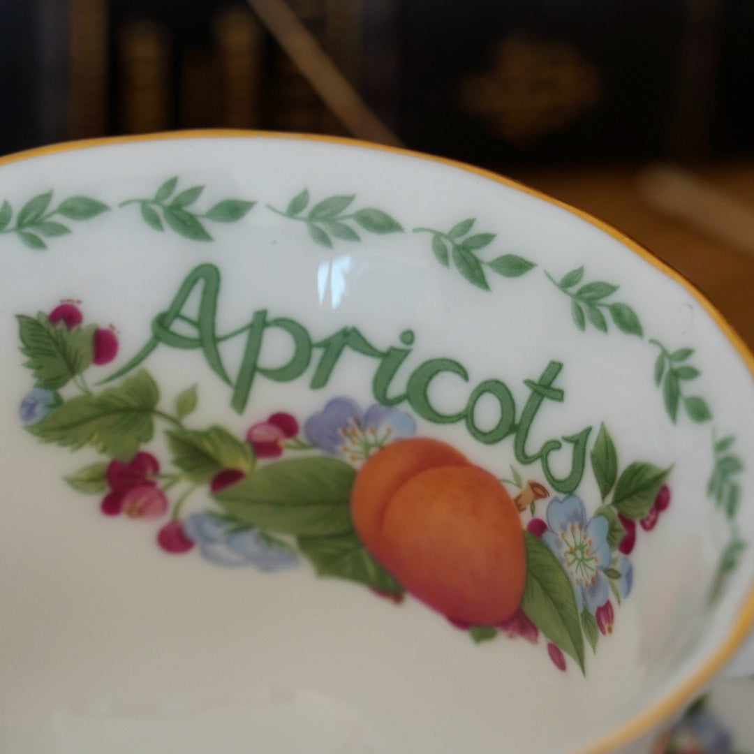 Soulignée d’un élégant liseré doré, elle incarne le raffinement du tea time à l’anglaise, avec une touche fruitée et ensoleillée. Une pièce gourmande et poétique, parfaite pour les amateurs de porcelaine vintage et de nature généreuse.