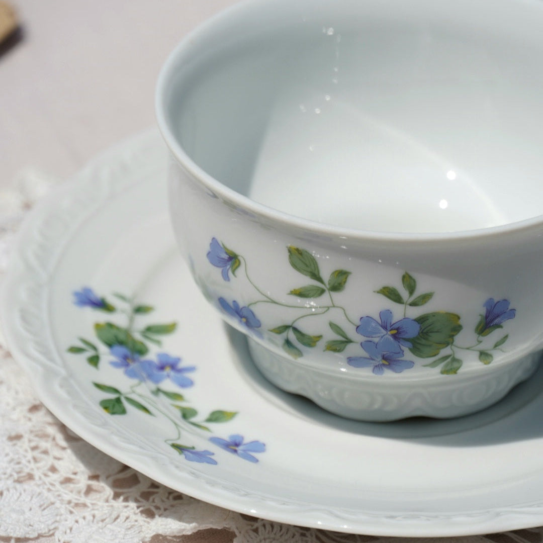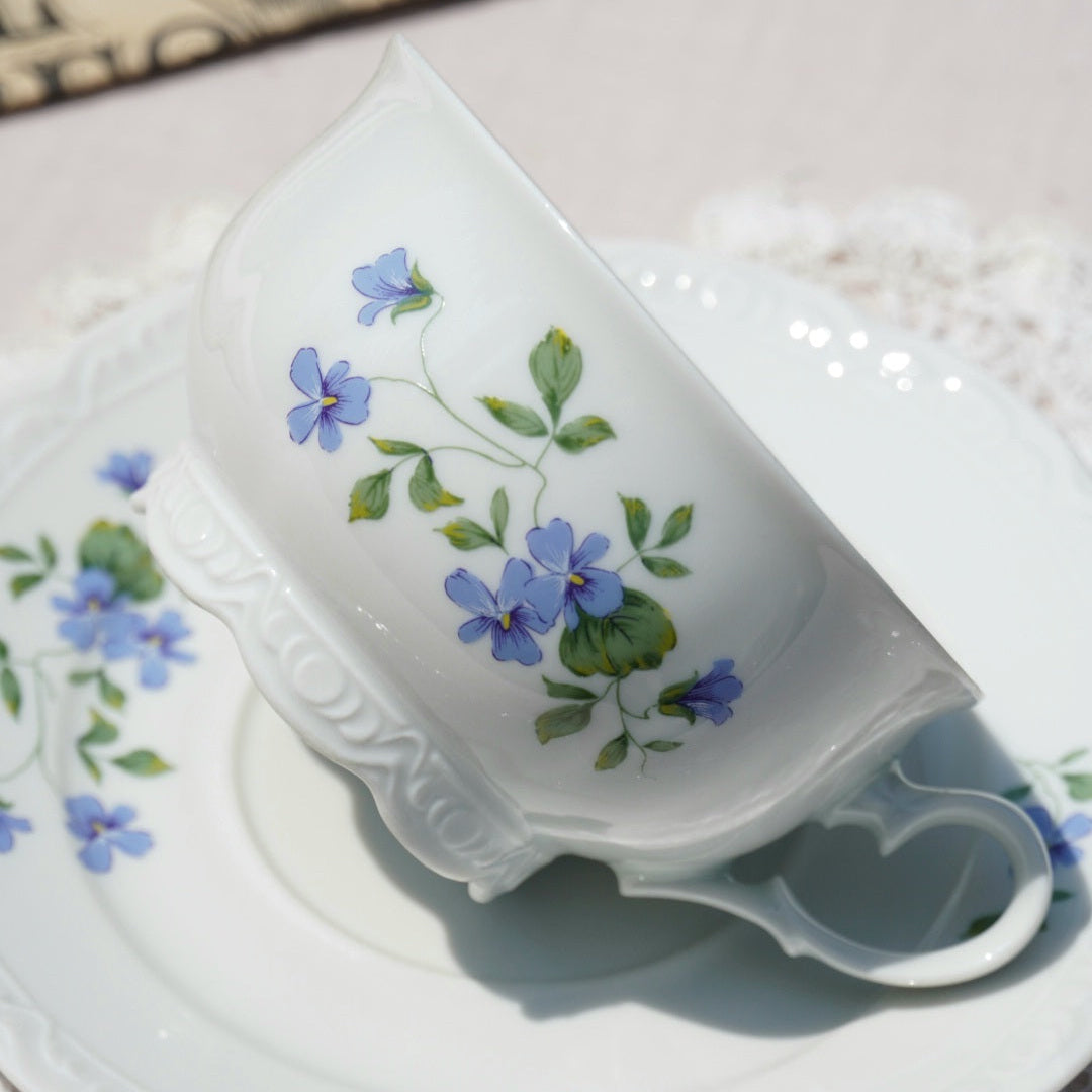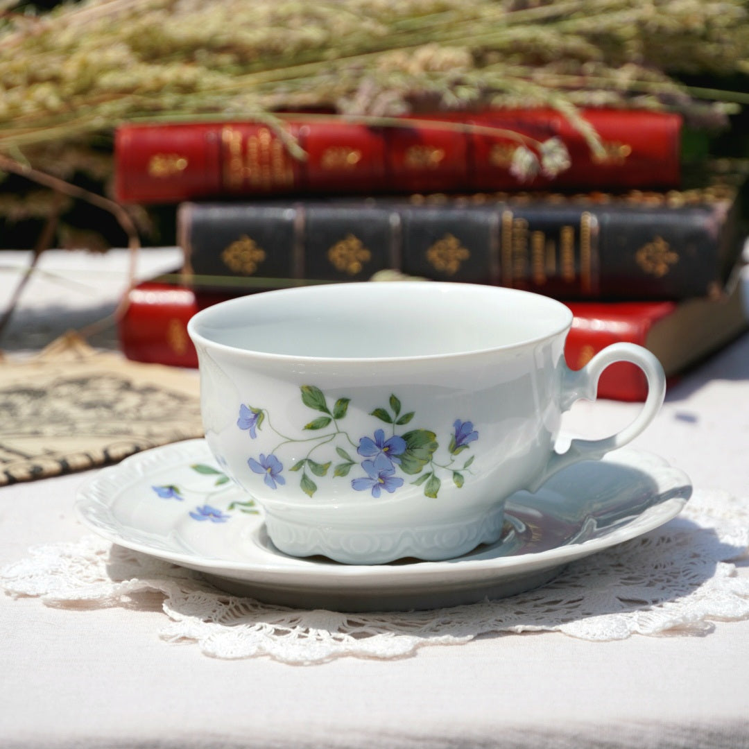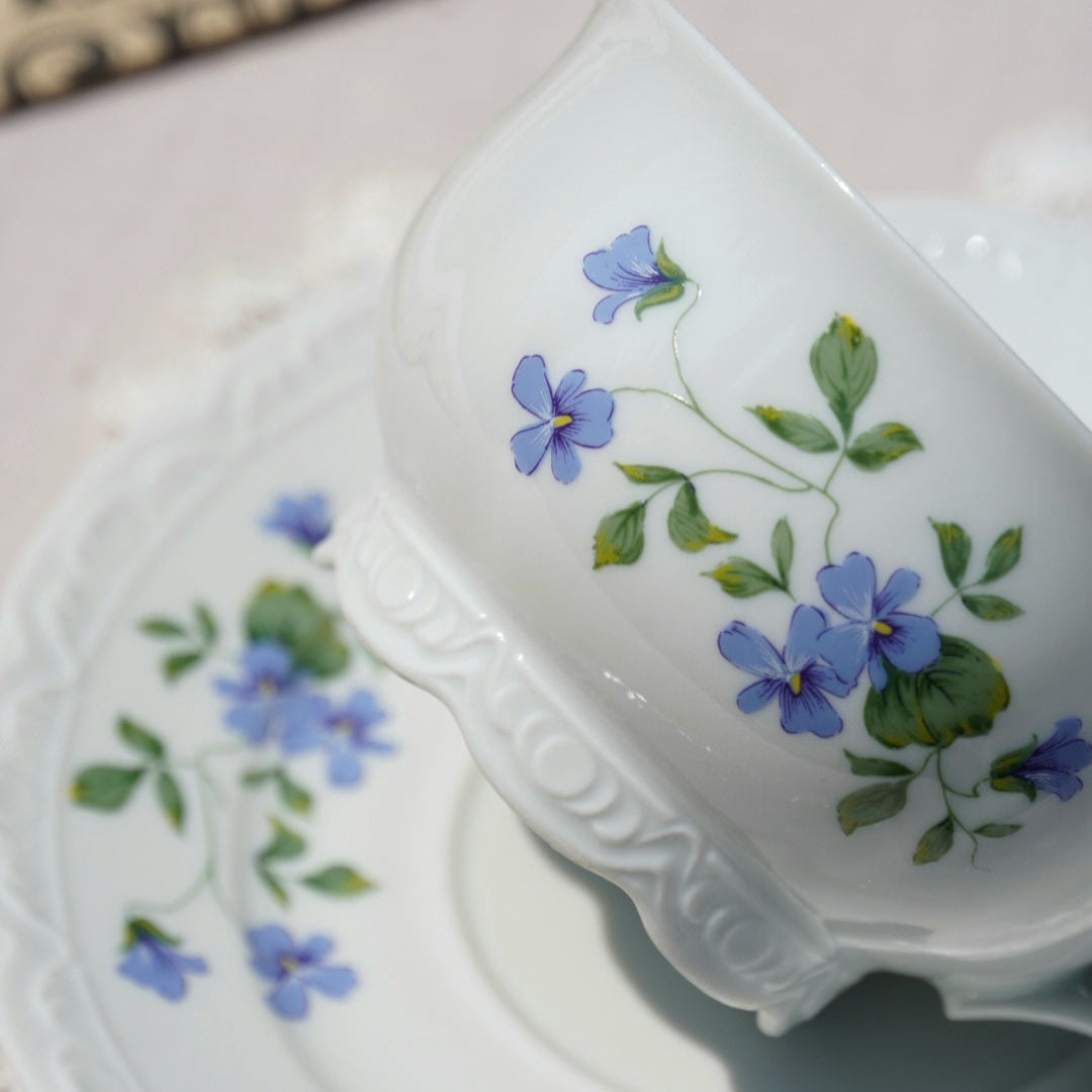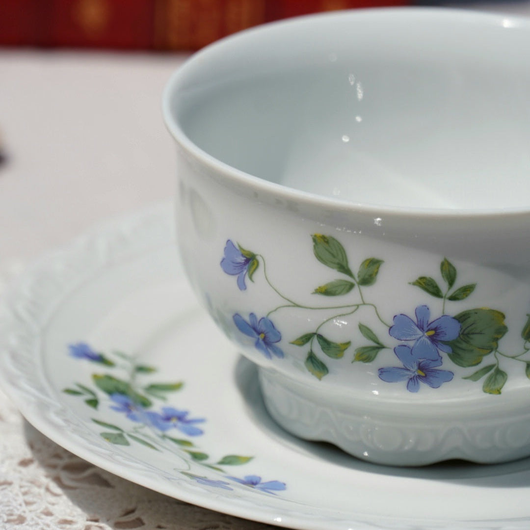 Laissez-vous séduire par cette tasse en porcelaine française délicatement ornée de motifs floraux aux teintes bleutées et violacées, estampillée L’Atelier de la Cigogne, maison artisanale installée à Colmar, dans le Haut-Rhin.