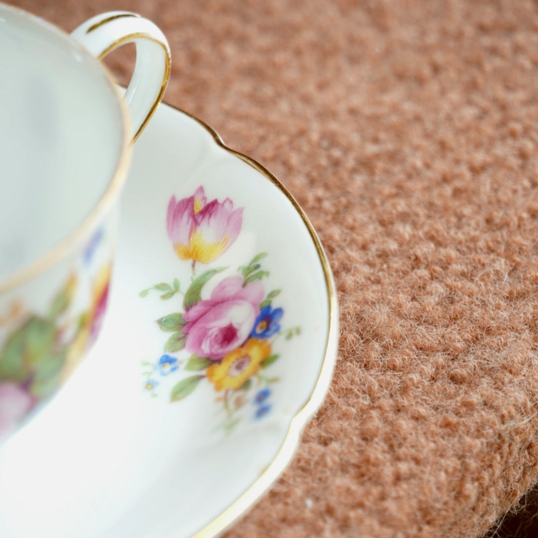 Véritables trésors vintage, chaque pièce est délicatement ornée d’un motif floral romantique, rehaussée de détails dorés à la main qui capturent la lumière avec subtilité.