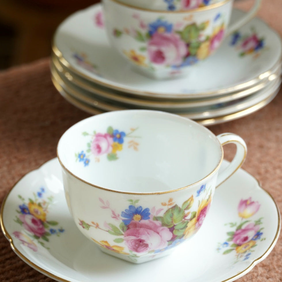 Tasses "Hortense" en porcelaine tchéque Epiag Czechoslovakia fleuries et dorées (lot de 5)