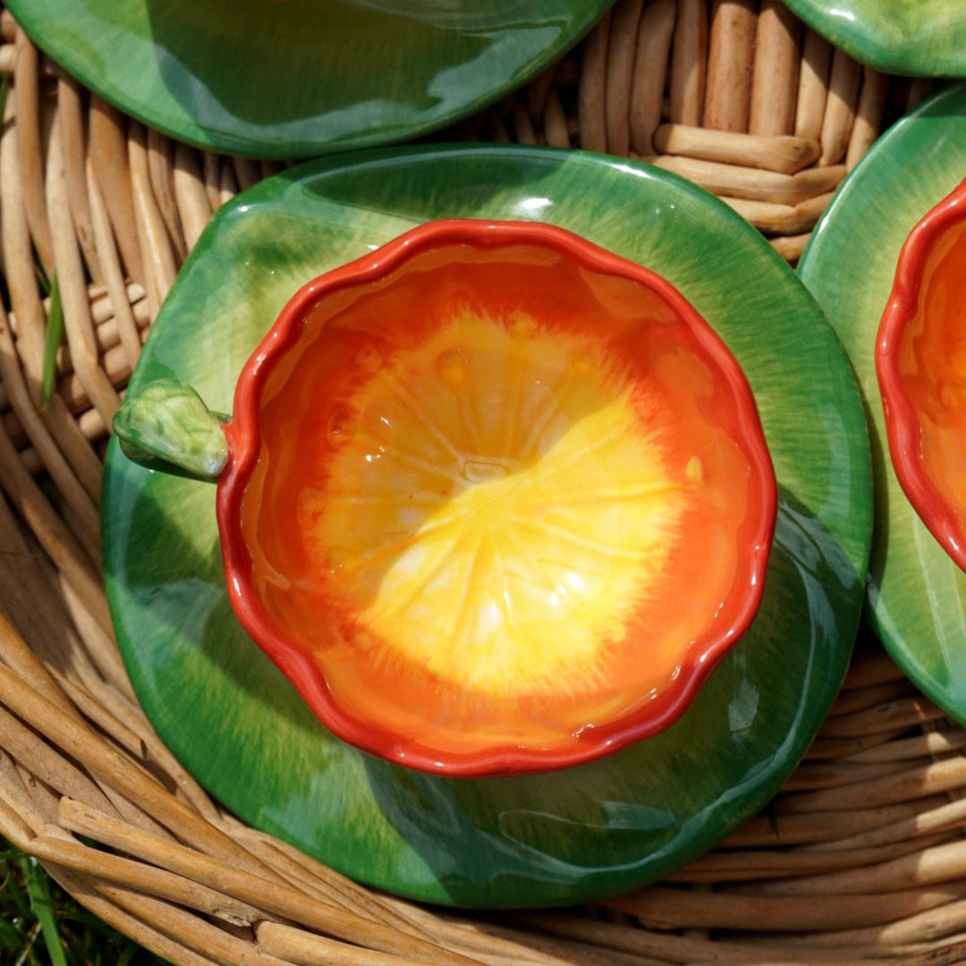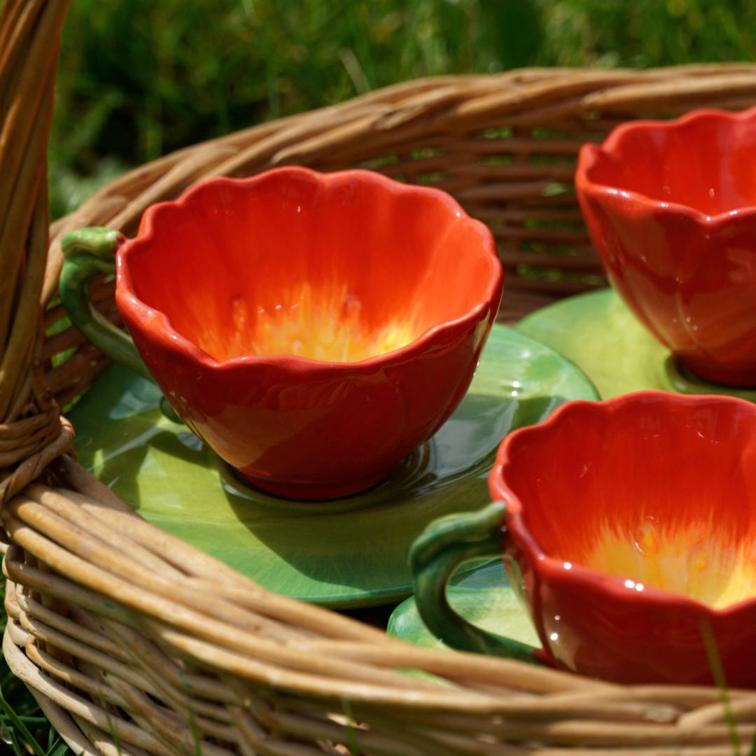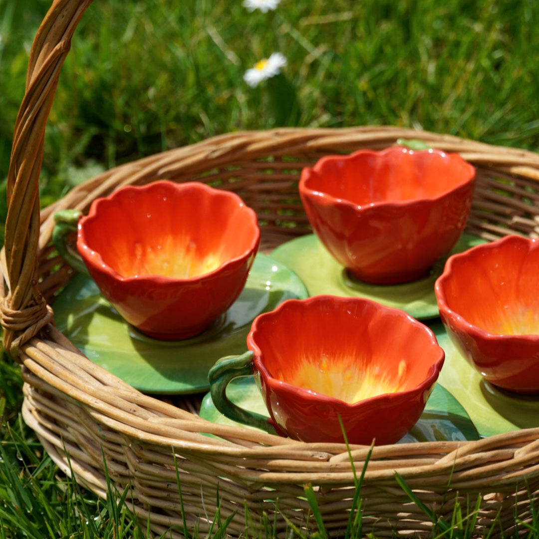 Leur forme sculpturale de fleur épanouie, aux pétales rouges vibrants et au cœur jaune vibrant, transforme chaque pause thé ou café en rituel délicat.